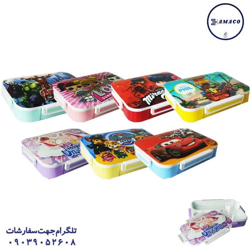 ظرف غذای با کیفیت با طراحی کارتونی و رنگهای جذاب؛ مناسب برای کودکان در مدرسه یا مهدکودک. سبک، با درب ایمن و با قیمت مناسب.